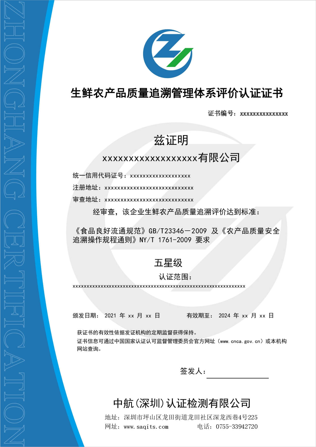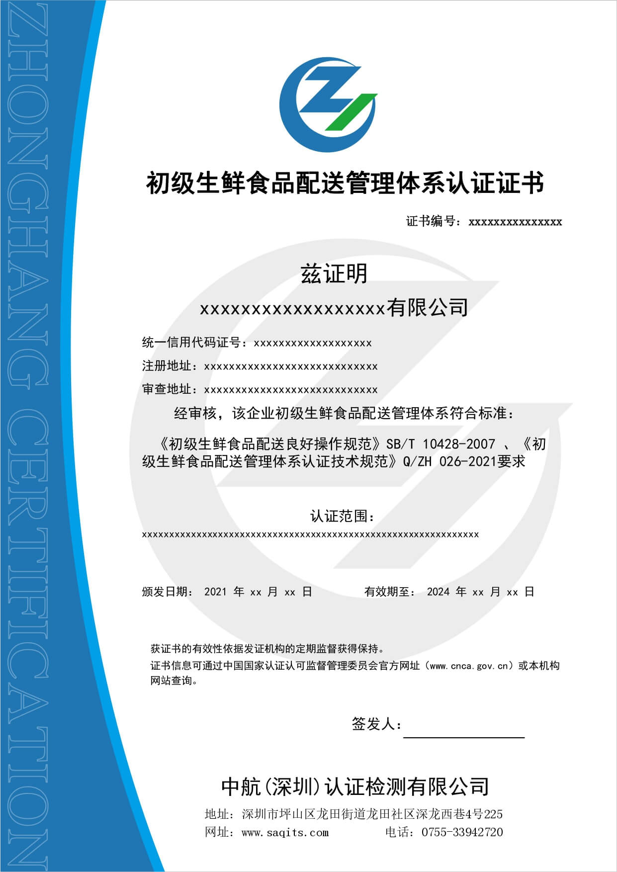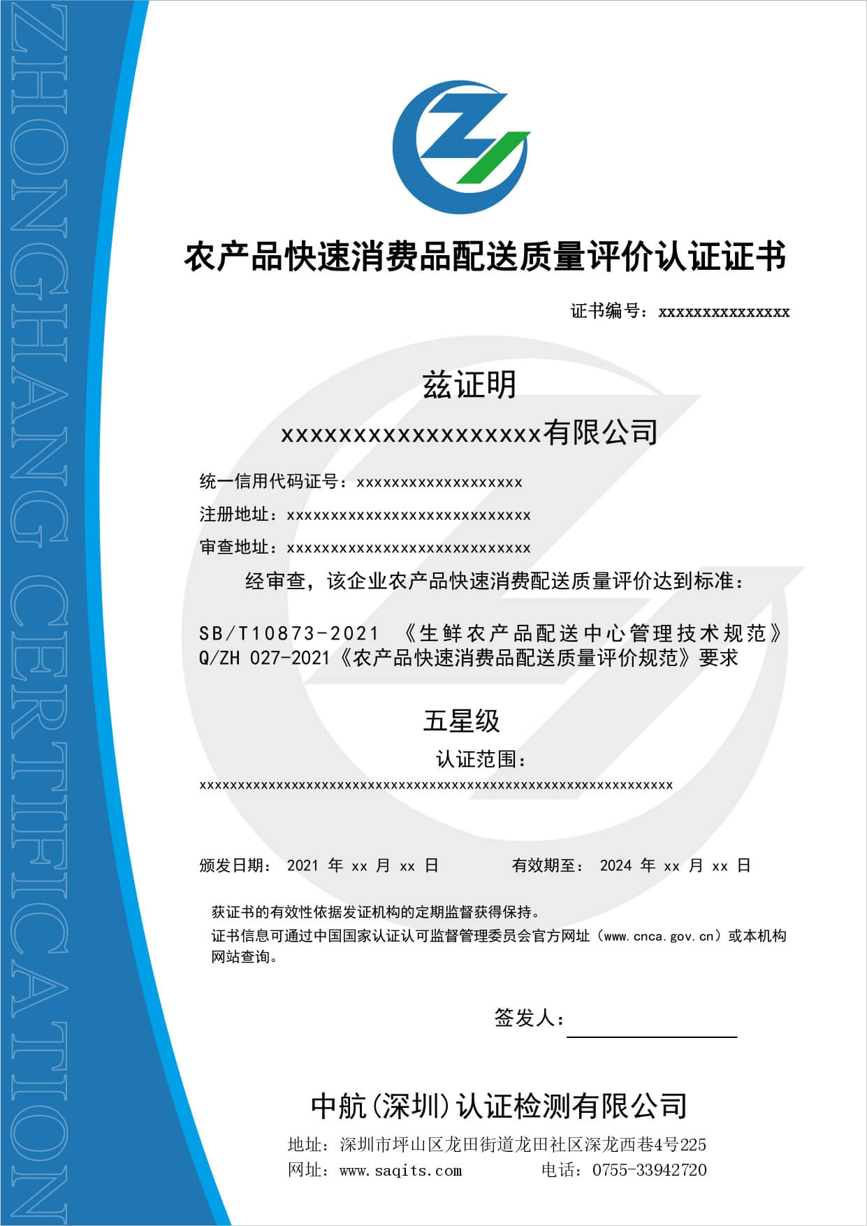 生鮮食品配送服務認證證書:1.保證生鮮食品以較短時間、較少流通環節進入消費環節;2.保證生鮮食品在流通中實現品質的穩定或提升;